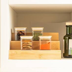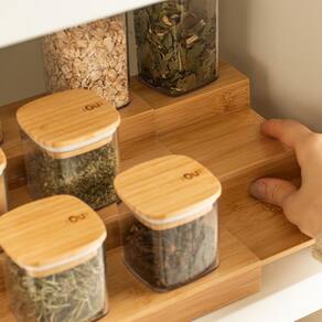 Eleve a organização da sua cozinha com o Kit Organizador Multinível Aspen Decor Esse conjunto sofisticado, feito em bambu 100% renovável, traz praticidade e elegância para otimizar o espaço e facilitar o acesso aos itens essenciais. Composto por um organizador multinível e 4 potes herméticos de 150ml, este kit promove uma rotina mais organizada e sustentável, ideal para manter temperos e outros ingredientes ao alcance.