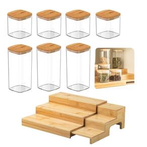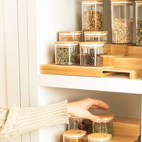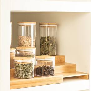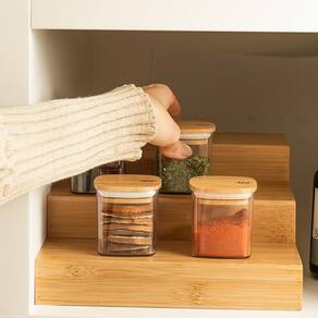 Eleve a organização da sua cozinha com o Kit Organizador Multinível Aspen Decor Esse conjunto sofisticado, feito em bambu 100% renovável, traz praticidade e elegância para otimizar o espaço e facilitar o acesso aos itens essenciais. Composto por um organizador multinível e 04 potes herméticos de 150ml e 03 Potes 340ml, este kit promove uma rotina mais organizada e sustentável, ideal para manter temperos e outros ingredientes ao alcance.