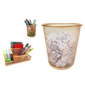 Kit escritório dourado ouro com 3 unidades Para quem gosta de ter tudo sempre à mão, com agilidade e praticidade. Kit completo de organizador, porta canetas e lixeira de escritório é ideal para você. Com eles, você vai evitar a perda de tempo procurando os itens de que precisa e que usa com frequência. Tudo estará a sua mão. O organizador de mesa de escritório tem 4 partes com tamanhos variados. permitindo organiza canetas, lápis, clips, bloco de notas e pequenos objetos. Kit escritório dourado ouro composto por:- 01 organizador de mesa escritório dourado ouro com 4 partições - 01 porta caneta, lápis dourado ouro- 01 lixeira aramada dourado ouro Cor: dourado ouro Material: metal - organizador de mesa escritório tamanho: 20x10x10cm largura x altura x comprimento - porta caneta, lápis tamanho: 10x9cm altura x diamêtro - lixeira tamanho: 27x23,5x18,5cm altura x diâmetro da boca x diâmetro da base Marca: Markys Store