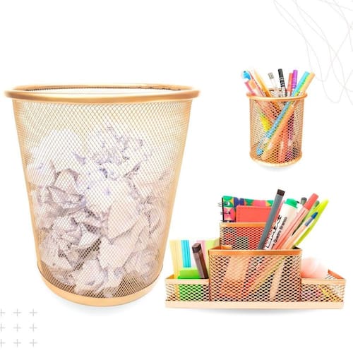O kit é composto por um organizador de mesa com 4 divisórias de tamanhos diferentes, um porta canetas e uma lixeira. Todos os itens são feitos de metal resistente e têm um design moderno e elegante. Eles vão ajudar você a guardar e encontrar facilmente os seus materiais de trabalho, como canetas, lápis, clips, bloco de notas e muito mais.