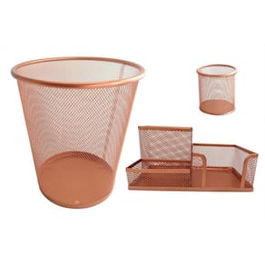 Kit escritório rose gold composto por: - 01 organizador de mesa escritório rose gold com 3 partições - 01 porta caneta, lápis rose gold - 01 lixeira aramada rose gold