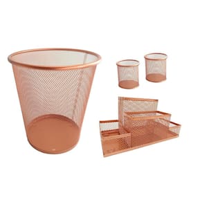 Kit escritório rose gold composto por: - 01 organizador de mesa escritório rose gold com 4 partições - 02 porta caneta, lápis rose gold - 01 lixeira aramada rose gold