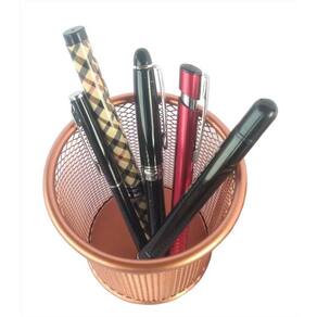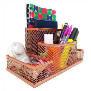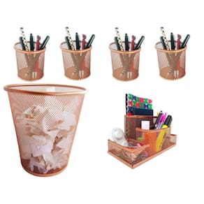 Kit escritório rose gold composto por: - 04 porta caneta, lápis rose gold - 01 organizador de mesa escritório rose gold com 4 partições - 01 lixeira aramada rose gold