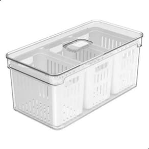 ASPEN DECOR F6278 KIT com 02 Organizador com Cesto Triplo 5L Clear Fresh - OU O organizador de geladeira Clear Fresh com cesto triplo 5L promove frescor prolongado para os alimentos, para uma rotina mais saudável e sem desperdícios. O sistema de ventilação mantém o nível de umidade ideal para cada alimento. A armazenagem com cestos evita que as frutas, verduras e legumes fiquem molhados após a lavagem, aumentando a durabilidade dos alimentos. Sinta o frescor de uma vida leve, saudável e organizada. Sua transparência facilita a visualização dos alimentos e a organização do ambiente. Produzido em material resistente PS Transparente , o organizador garante durabilidade, praticidade e fácil higienização. Transparência, beleza e cuidado com o alimento são características da linha Clear Fresh, perfeitas para auxiliar na organização da sua geladeira e facilitar o seu dia a dia. Livre de BPA. Lavar com sabão neutro e esponja macia. -não levar ao micro-ondas -não levar ao freezer -não levar à lava-louças Contém: 2 cesto com tampa 6 cestos independentes Medidas: 15 x 30 x 13cm Marca: Ou do vendedor: 90 dias Marca: Não Informado