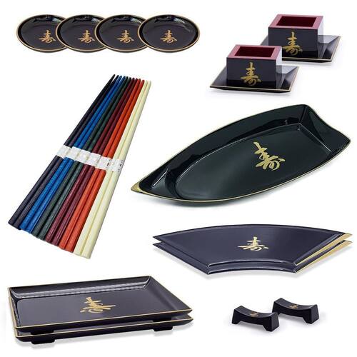Jogo de jantar oriental com acabamento preto laqueado de excelente qualidade, alto brilho e pintura do ideograma em dourado que representa felicidade. Peças indispensáveis para amantes da culinária oriental. Cores fortes inspiradoras nas tradicionais decorações japonesas podendo auxiliar no serviço de sushis, sashimis e outras iguarias. Cuidados: - Lavar com água morna e sabão neutro utilizando esponja macia, seguido de pano seco. - Não utilizar produtos químicos ou abrasivos na limpeza. - Não vai à lava-louças.