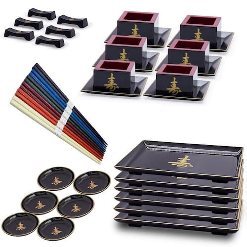 - 6 x Unidades de Molheiras - 6 x Unidades de Descanso para Hashi - 6 x Unidades de Copo para saque - 6 x Unidades de Prato para Saque - 6 x Prato Retangular - 6 x Hashi