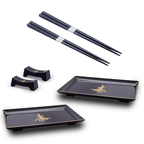 Kit Oriental Para 2 Pessoas Descanso Hashi Prato Retangular Kit oriental com acabamento preto laqueado de excelente qualidade, alto brilho e pintura do ideograma em dourado que representa felicidade. Peças indispensáveis para amantes da culinária oriental. Cores fortes inspiradoras nas tradicionais decorações japonesas podendo auxiliar no serviço de sushis, sashimis e outras iguarias. Cuidados: - Lavar com água morna e sabão neutro utilizando esponja macia, seguido de pano seco. - Não utilizar produtos químicos ou abrasivos na limpeza. - Não vai à lava-louças. Características: Prato Retangular: Altura: 2cm Largura: 13,5 Comprimento: 19cm Composição: A.B.S Hashi: Espessura: 1cm Comprimento: 21cm Descanso Hashi: Altura: 1,6cm Largura: 2,3cm Comprimento: 5,5cm Conteúdo: - 2 x Unidade de Prato Retangular - 2 x Pares de hashi - 2 x Unidades de Descanso hashi