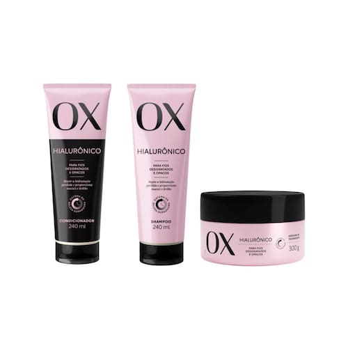Kit ox hialurônico condicionador 240ml + shampoo 240ml + máscara 300g Descrição O kit ox hialurônico, composto por 1 condicionador de 240ml, 1 shampoo de 240ml e 1 máscara de tratamento de 300g, oferece um cuidado completo para cabelos ressecados e sem vida. Enriquecido com ácido hialurônico, o shampoo limpa suavemente, o condicionador hidrata profundamente, e a máscara proporciona um tratamento intensivo, restaurando a umidade natural dos fios. O resultado são cabelos macios, brilhantes, hidratados e com movimento leve e natural. Modo de uso Shampoo ox hialurônico 240ml Aplique o shampoo nos cabelos molhados, massageando suavemente até formar espuma. Enxágue bem e, se necessário, repita o processo. Condicionador ox hialurônico 240ml Após lavar com o shampoo, aplique o condicionador nos cabelos úmidos, distribuindo do comprimento às pontas. Deixe agir por 2 a 3 minutos e enxágue completamente. Máscara ox hialurônico 300g Aplique a máscara nos cabelos limpos e úmidos, distribuindo uniformemente do comprimento às pontas. Deixe agir por 5 a 10 minutos para uma hidratação profunda. Enxágue bem. Use 1 a 2 vezes por semana para resultados mais intensivos. Marca: Não Informado Ean: 7908945230069