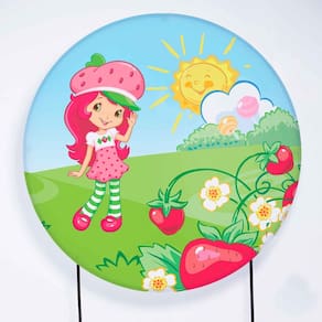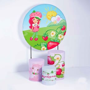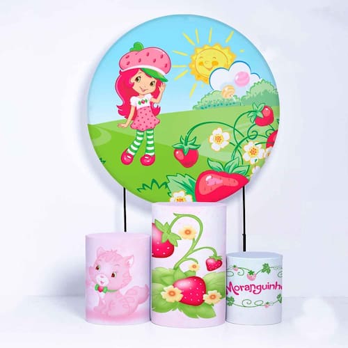 Kit Painel de Festa Redondo de 1,50m e Trio de Cilindros Moranguinho - Fera Print