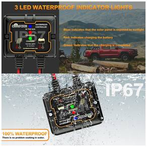 Ampla aplicação Pode ser como carregador de bateria solar e mantenedor para diferentes baterias de 12V DC, como Wet, Gel, MF, EFB e AGM. Uma variedade de cenários para RV, carro, barco, marinho, campista, cortador de grama, motocicleta, jet ski, bomba dágua, galpão, abridor de portão, etc.