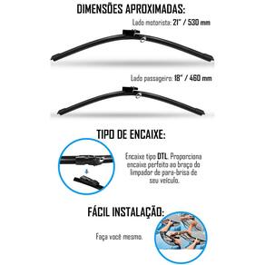 As palhetas do lado do motorista possuem 21 polegadas 530mm , enquanto as do lado do passageiro possuem 18 polegadas 460mm . Elas são compatíveis com veículos que possuem encaixe tipo DTL e substituem as palhetas convencionais. Com um peso de apenas 250 gramas, elas não comprometem o funcionamento do seu veículo.