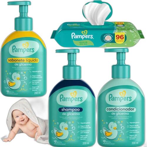 Kit Pampers Baby Glicerina 96 Lenço Umedecido AromaAloe Vera Bem vindo a a loja Flocus. É um prazer tê-lo a como nosso a cliente CONTEÚDO DO KIT: 1 Shampoo Pampers Glicerina - 200ml 1 Condicionador Pampers Glicerina - 200ml 1 Sabonete Líquido para o Corpo Pampers Glicerina - 200ml 1 Lenço Umedecido Pampers Aroma de Aloe Vera 96 unidades Pampers Glicerina proporciona limpeza suave e segura do cabelo delicado de bebês e crianças. Ideal para todos os tipos de cabelo do bebê. O kit de Glicerina Pampers traz uma fórmula hipoalergênica pensada para o cuidado especial do cabelo delicado dos bebês e segura até para couro cabeludo sensível, trazendo maior suavidade e mantendo os fios macios. Além disso, proporciona uma lavagem suave e sem irritações nos olhos, evitando o desconforto das lágrimas durante o banho. Conta com pH ideal para o couro cabeludo do bebê e perfumação suave e segura para recém-nascidos. Não contém nenhum álcool etílico, fenoxietanol, parabenos e corantes. Fórmula biodegradável, vegana e livre de crueldade animal, com 97% de ingredientes naturais. Testado, aprovado e recomendado por pediatras e dermatologistas. Sabonete líquido infantil. Pampers Glicerina oferece limpeza suave da cabeça aos pés, para cuidar da pele delicada dos bebês. O Sabonete Líquido Pampers Glicerina foi criado pensando em um banho suave e seguro. Sua fórmula com Glicerina e Óleo de Girassol confere maior suavidade e mantém a pele do bebê macia. Com fórmula hipoalergênica, o sabonete da Pampers é seguro até para pele sensível e pode ser desde os primeiros dias. Conta com pH ideal para a pele do bebê e perfumação suave, segura para recém-nascidos. Os Lenços Umedecidos Pampers com Cheirinho De Aloe Vera que foram criados para aquela limpeza prática do dia a dia, porque além de serem suaves e resistentes, hidratam e refrescam a pele do seu bebê sem causar irritações, e podem ser em bumbuns, mão e rosto. Seu bebê limpinho e sem pele irritada com Pampers BENEFÍCIOS: Limpeza completa da cabeça aos pés; Sem álcool, fenoxietanol, parabenos e corantes; Testado e aprovado por pediatras e dermatologistas; Seguro até para couro cabeludo sensível; Hipoalergênico e seguro desde os primeiros dias; 98% de ingredientes naturais; Fórmula vegana e livre de crueldade animal; Mais suavidade e mantém a pele do neném macia; Hipoalergênico; Sem lágrimas. MODO DE USAR: Shampoo: Coloque um pouco do shampoo em uma das mãos e espalhe pelo cabelinho molhado do bebê durante o banho. Massageie suavemente e enxágue em seguida com água. Condicionador: Coloque um pouco do condicionador ao longo dos fios e espalhe pelo cabelinho molhado do seu bebê durante o banho. Desembarace com facilidade deixando agir por alguns minutos. Enxágue bem em seguida com água. Sabonete líquido: Coloque um pouco do sabonete líquido em uma das mãos. Espalhe por todo o corpinho e cabelinhos molhados do seu bebê durante o banho. Massageie suavemente. Enxágue em seguida com água. Lenço umedecido: Para abrir a embalagem, levantar a etiqueta no local indicado. Retire uma toalhinha umedecida e use nas áreas que deseja limpar. OBS: Não jogue no vaso. Jogue a toalhinha umedecida Utilizado no lixo. OBS 2:Manter a embalagem bem fechada para conservar a qualidade do produto. Orientações ao Consumidor: Agradecemos por escolher a Loja Flocus e por confiar em nós para cuidar da beleza dos seus cabelos. Em caso de dúvidas, favor enviar sua pergunta Flocus
