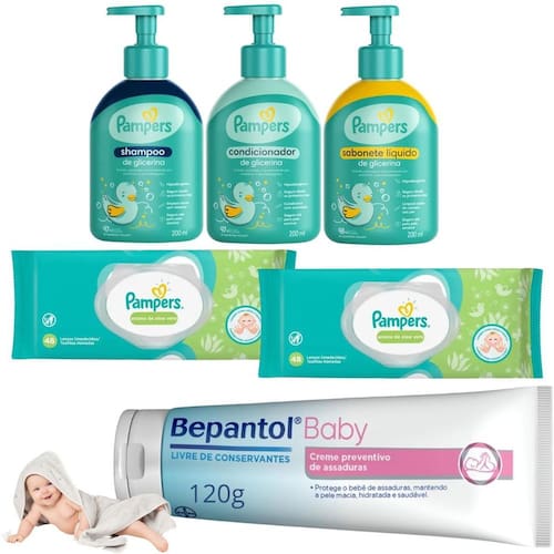 Kit Pampers Bepantol Baby Creme Assaduras Pró-Vitaminas Bem vindo a a loja Flocus. É um prazer tê-lo a como nosso a cliente CONTEÚDO DO KIT: 1 Shampoo Pampers Glicerina - 200ml 1 Condicionador Pampers Glicerina - 200ml 1 Sabonete Líquido para o Corpo Pampers Glicerina - 200ml 1 Creme Preventivo de Assaduras Bepantol Baby - 120g 2 pac. Lenços Umedecidos Pampers Aroma de Aloe Vera 48 unidades cada Pampers Glicerina proporciona limpeza suave e segura do cabelo delicado de bebês e crianças. Ideal para todos os tipos de cabelo do bebê. O kit de Glicerina Pampers traz uma fórmula hipoalergênica pensada para o cuidado especial do cabelo delicado dos bebês e segura até para couro cabeludo sensível, trazendo maior suavidade e mantendo os fios macios. Além disso, proporciona uma lavagem suave e sem irritações nos olhos, evitando o desconforto das lágrimas durante o banho. Conta com pH ideal para o couro cabeludo do bebê e perfumação suave e segura para recém-nascidos. O Sabonete Líquido Pampers Glicerina foi criado pensando em um banho suave e seguro. Sua fórmula com Glicerina e Óleo de Girassol confere maior suavidade e mantém a pele do bebê macia. Com fórmula hipoalergênica, o sabonete da Pampers é seguro até para pele sensível e pode ser desde os primeiros dias. Conta com pH ideal para a pele do bebê e perfumação suave, segura para recém-nascidos. Os Lenços Umedecidos Pampers com Cheirinho De Aloe Vera que foram criados para aquela limpeza prática do dia a dia, porque além de serem suaves e resistentes, hidratam e refrescam a pele do seu bebê sem causar irritações, e podem ser em bumbuns, mão e rosto. Seu bebê limpinho e sem pele irritada com Pampers Incluímos nesse kit baby o Creme Antiassaduras Bepantol Baby que vai além dos antiassaduras comuns. Com sua fórmula exclusiva, livre de conservantes, forma uma barreira transparente que deixa a pele delicada do seu bebê respirar, mantendo-a sempre saudável. Possui Lanolina, que forma uma barreira protetora transparente no bumbum, e Pró-Vitamina B5, que penetra na pele do bebê deixando-a mais resistente contra assaduras. Além disso, Bepantol Baby é livre de perfumes, corantes e parabenos que podem sensibilizar a pele delicada do bebê. BENEFÍCIOS: Limpeza completa da cabeça aos pés; Sem álcool, fenoxietanol, parabenos e corantes; Testado e aprovado por pediatras e dermatologistas; Seguro até para couro cabeludo sensível; Hipoalergênico e seguro desde os primeiros dias; 98% de ingredientes naturais; Fórmula vegana e livre de crueldade animal; Mais suavidade e mantém a pele do neném macia; Hipoalergênico; Sem lágrimas. Bepantol Baby: protege a pele das assaduras, além de mantê-la resistente, macia e hidratada. MODO DE USAR: Shampoo: Coloque um pouco do shampoo em uma das mãos e espalhe pelo cabelinho molhado do bebê durante o banho. Massageie suavemente e enxágue em seguida com água. Condicionador: Coloque um pouco do condicionador ao longo dos fios e espalhe pelo cabelinho molhado do seu bebê durante o banho. Desembarace com facilidade deixando agir por alguns minutos. Enxágue bem em seguida com água. Sabonete líquido: Coloque um pouco do sabonete líquido em uma das mãos. Espalhe por todo o corpinho e cabelinhos molhados do seu bebê durante o banho. Massageie suavemente. Enxágue em seguida com água. Lenço umedecido: Para abrir a embalagem, levantar a etiqueta no local indicado. Retire uma toalhinha umedecida e use nas áreas que deseja limpar. OBS: Não jogue no vaso. Jogue a toalhinha umedecida Utilizado no lixo. OBS 2:Manter a embalagem bem fechada para conservar a qualidade do produto. Bepantol Baby: Aplique uma camada de Bepantol Baby em toda a troca de fralda. Agradecemos por escolher a Loja Flocus e por confiar em nós para cuidar da beleza dos seus cabelos. Em caso de dúvidas, favor enviar sua pergunta Flocus