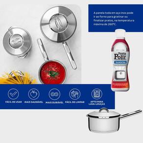 O Kit Panela Tramontina Solar 16 cm Inox + Pasta para Polir é a combinação ideal de praticidade, durabilidade e sofisticação para a sua cozinha. A Panela Tramontina Solar 16 cm é fabricada em aço inox de alta qualidade, garantindo resistência, beleza e fácil limpeza. Seu fundo triplo aço inox + alumínio + aço inox distribui o calor de forma uniforme, permitindo cozimento mais rápido e econômico. Compatível com fogões a gás, elétricos, vitrocerâmicos e de indução, é uma peça versátil que também pode ser levada ao forno até 260 C.