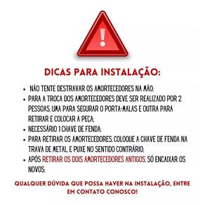 Dicas para a Instalação: *Não tente destravar os amortecedores com as mãos, pois só conseguirá destravar depois de instalado no veículo; *A troca dos amortecedores tem que ser realizada por duas pessoas, uma para retirar e colocar as peças, e a outra para segurar o porta-malas; *Necessário somente 1 chave de fenda; *Para retirar os amortecedores antigos, já instalados no carro, coloque a chave de fenda na trava de metal, e puxe no sentido contrário; *Após retirar OS DOIS amortecedores antigos, só encaixar os novos;