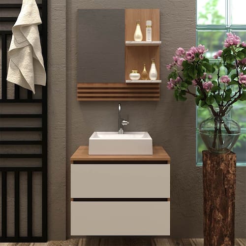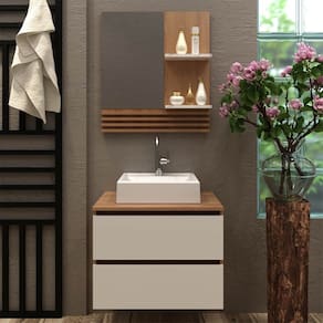 O Kit para Banheiro é a escolha ideal para dar um toque de elegância e organização ao seu espaço. Com um design contemporâneo, ele transforma o ambiente em um local mais convidativo e prático. Fabricado com materiais de alta qualidade, o kit oferece durabilidade e um visual sofisticado, tornando seu banheiro ainda mais funcional e bonito. CARACTERÍSTICAS TÉCNICAS: - Produzida em MDP de 15 mm - Acabamento UV na cor Branco, Amêndoa e Mármore Branco - Cuba em Mármore Sintético - Acompanha Espelho - Gavetas com Corrediças Metálicas - Puxador tipo Cava - Balcão Suspenso *Kit Composto por Gabinete Suspenso (3607), Espelheira (3614) e Cuba (3630) INFORMAÇÕES TÉCNICAS: 3607: Alt. 46,5 cm x Larg. 60 cm x Prof. 46,9 cm x P. 15,9 kg 3614: Alt. 44,7 cm x Larg. 60 cm x Prof. 38,7 cm x P. 12,65 kg 3630: Alt. 11,5 x Larg. 35 x Prof. 334 cm P. 5,5 kg INFORMAÇÕES ADICIONAIS: - ATENÇÃO: Não trabalhamos e não nos responsabilizamos pela montagem do móvel. Antes da montagem conferir se o produto está de acordo com o que comprou, produto montado e danificado pela montagem não será aceito troca. Montagem e instalação por conta do comprador. - As imagens ambientadas são meramente ilustrativas e podem apresentar itens que não compõe o produto. As cores do produto podem variar de acordo com o monitor, a iluminação do ambiente ou sua percepção visual. - Limpeza: Deve ser feita com pano macio e seco ou levemente umedecido com água e sabão neutro. Não devem ser utilizados abrasivos como palha de aço e objetos cortantes. -Garantia para defeitos de fabricação conforme Código de Defesa do Consumidor.