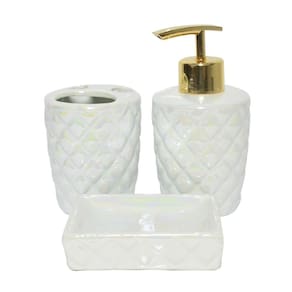 Kit para banheiro lavabo 3 peças sereia escamas perolado Cor: branco Deixe seu banheiro ainda mais lindo com esse kit, possui pintura perolada que da ainda mais brilho e sofisticação para o ambiente, o kit conta com 1 porta sabonete liquido, 1 porta sabonete e 1 porta escovas de dente/pasta.
