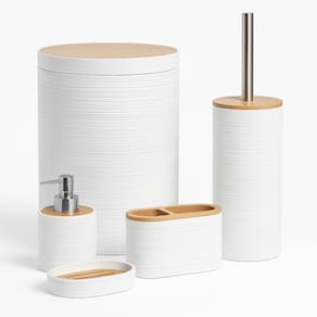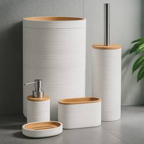 Renove seu banheiro com elegância, funcionalidade e um toque natural com este Kit de Banheiro 5 Peças com Detalhes em Bambu. Com design moderno, acabamento branco texturizado e tampa em bambu natural, o conjunto é ideal para quem busca praticidade sem abrir mão da estética.
