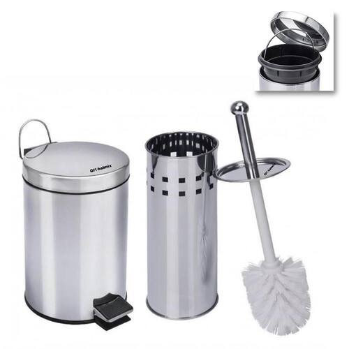 Lixeira de banheiro 5 litros e escova sanitária, em aço inox e com detalhes sofisticados. Lixeira com balde removível e pedal acoplado que auxilia na higiene e evita a proliferação de bactérias, também com sistema soft close, que proporciona um fechamento suave. A escova sanitária com cerdas flexíveis, e com ótima durabilidade e resistência. Marca: global mix características -cor: prata; -material: aço inox 410, abs, borracha e nylon; -dimensões da peça: lixeira de 5 litros: 20,3x27,8cm escova sanitária: 9,5x 34,5cm