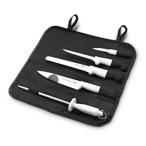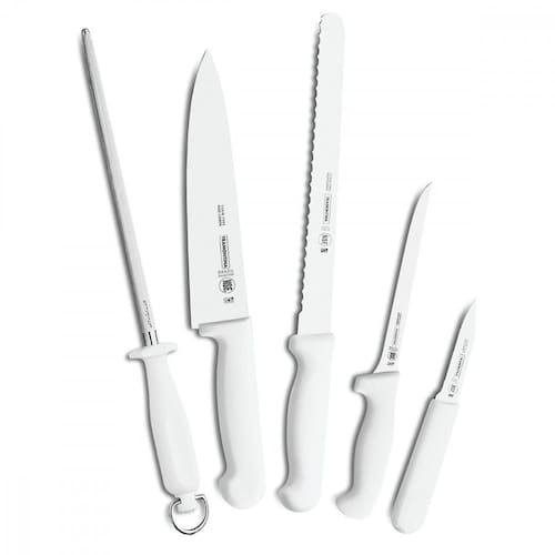 Kit Para Chefs Com Facas Tramontina Com Laminas Em Aço Inox E Cabos De Polipropileno Branco 6 Peças Kit para Chefs com Facas Tramontina com Lâminas em Aço Inox e Cabos de Polipropileno Branco 6 Peças Se você quer dar um upgrade no preparo de seus pratos, o Kit para Chefs com Facas Tramontina com Lâminas em Aço Inox e Cabos de Polipropileno Branco 6 Peças é a escolha ideal. As facas do kit contam com lâminas em aço inox e cabos em polipropileno injetado na cor branca, que garantem muito mais resistência e durabilidade à peça e a chaira possui haste em aço carbono revestida com cromo-duro, garantindo uma performance de alto desempenho na hora da afiação. Para dar ainda mais estilo ao seu conjunto, as peças vêm em um belo estojo de nylon. Com esse kit, fica fácil ser um grande Chef!