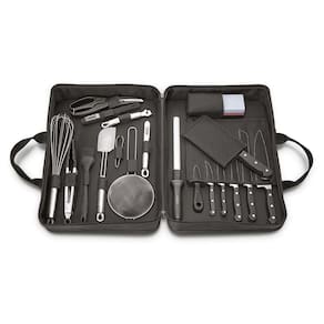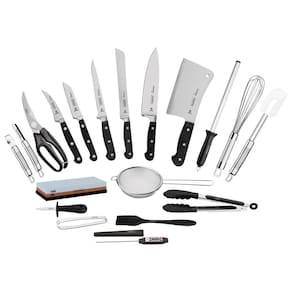 Mais Informações - As lâminas forjadas de aço inox especial garante um fio com maior durabilidade e precisão. As lâminas possuem tratamento térmico diferenciado, composto por têmpera, sub- e revenimento. E contam com dureza da lâmina de 55 e 58 HRC, que garante maior resistência do fio e precisão no corte. Os cabos de policarbonato reforçado com fibra de vidro garante alta durabilidade, equilíbrio e . Chaira com haste em aço inox com a superfície diamantada de alta capacidade de afiação. Cabo em ABS com design ergonômico que oferece maior conforto e . Pedra para afiar dupla face com grãos mistos para duas opções de afiação e suporte antideslizante que oferece maior durante o uso. Batedor, peneira, descascador, rapador e pinça de aço inox. Espátula e pegador de silicone com cabo de aço inox que permite uso em temperaturas de até 210 C. Pincel de silicone que permite uso em temperaturas de até 210 C. Termômetro digital com haste de aço inox e visor de cristal líquido. Faca para ostra com lâmina de aço inox e cabo de polipropileno antiderrapante. Estojo de nylon que oferece uma proteção as peças, permitindo o e armazenagem com maior .