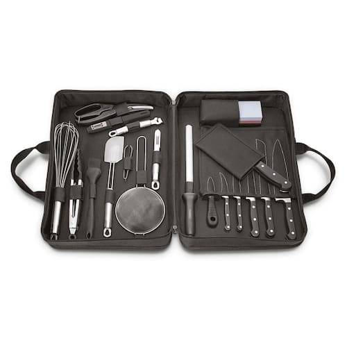 Se você é um amante da boa gastronomia e não abre mão de receber seus amigos em casa com o melhor, não há outra coisa a fazer a não ser garantir o Kit para Chefs Tramontina em Aço Inox Cabo de Policarbonato e Fibra de Vidro com Maleta 20 Peças, da linha Century. Com ele você tem, em uma linda maleta de nylon, facas com lâminas de aço inox de altíssima qualidade que, aliada ao eficiente com tratamento térmico diferenciado, composto por têmpera, sub- e revenimento, além de dureza de 55 e 58 HR e cabos de policarbonato com fibra de vidro; chaira com haste em aço inox com superfície diamantada e cabo em ABS; batedor, descascador, boleador e coador de aço inox, um pegador e espátula de aço inox com silicone. Além de tudo isso, você ainda tem um termômetro com haste de aço inox, uma tesoura e faca de ostra com lâmina em aço inox e cabo em polipropileno e uma pinça de aço inox. É ou não é o conjunto mais completo para você fazer suas melhores receitas em casa? Não perde tempo. Seja o Chef mais elogiado da sua cozinha e arranque sorrisos e elogios dos seus convidados.