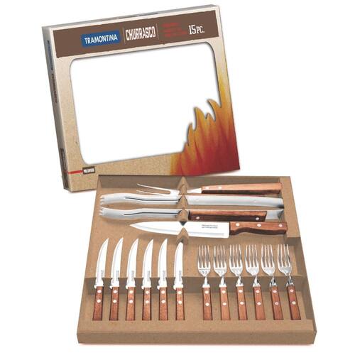 Informações Técnicas: Facas: lâminas com maior durabilidade do fio devido ao tratamento térmico. Garfos: a espessura do aço e a estampagem das lâminas garantem maior resistência aos produtos, evitando deformações. Cabos rústicos e naturais. Permanecem bonitos por muito mais tempo. Lâminas em aço inox. Cabos de madeira fixados por rebites de alumínio. Referência: 22399028 Informações Adicionais: Churrasco brasileiro é um dos mais respeitados do mundo e nasceu no pampa, na região Sul do país. A Tramontina tem muito orgulho de ter nascido no mesmo lugar. É por isso que criou uma linha de produtos completa com o melhor aço, madeira tratada e muita tecnologia para você fazer bonito e continuar evoluindo o seu churrasco sempre.
