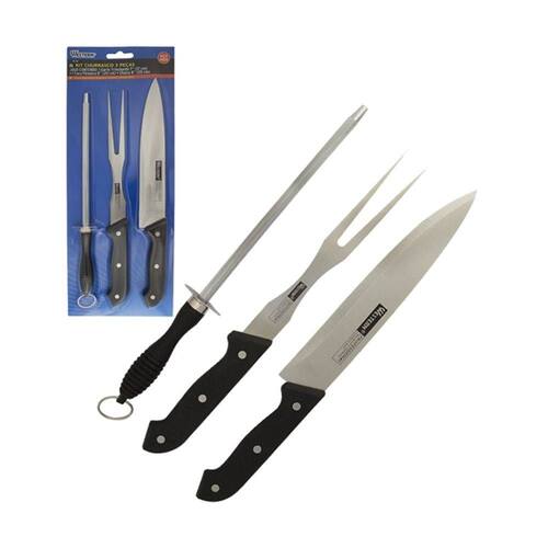 Descrição Kit Churrasco 3 Peças Western N-23 - Material: Aço Inoxidável, PP - Cor: Cor cabo preto - Tipo de Embalagem: Blister - Marca: Westem - Origem: China Indicações: - Indicada para cortar e fatiar carnes, legumes, frutas, e também para picar cebola, temperos em geral, alho e salsinha. - Faca legumes -indicada para descascar e cortar legumes e frutas. também faz cortes pequeno e decorativo. Garfo trinchante Indicado para manusear peças de bife ou carne crua. - Recomendações: - Mantenha a faca afiada. - Sempre guarde a faca e o garfo secos Atenção: - Cuidado ao manusear produtos cortantes e perfurantes. - Guarde em local seguro. - Guarde estas instruções para futuras consultas. - Manter fora do alcance das crianças. Marca: Westem Ean: 7897186082813