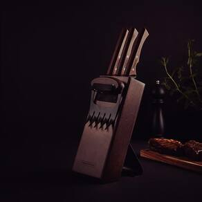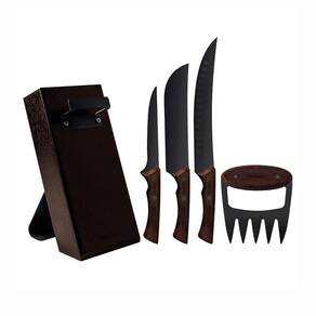 - Composição do Kit: 1 Faca para Carne 8", 1 Faca Butcher 10", 1 Faca para Desossar 6", 1 Garra Multiuso, 1 Suporte de Madeira para Facas;