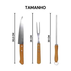 Jogo para Churrasco 3 PEÇAS com Lâminas em Aço Inox e Cabos de Madeira Natural 3 Peças você irá servir as melhores carnes de um jeito prático e saboroso. São três peças ideais para levar bom gosto e sofisticação à este momento. Com lâmina em aço inox, a faca de 7 polegadas possui maior durabilidade do fio devido ao tratamento térmico. O garfo e pegador contam com maior espessura e uma estampagem do aço que garante maior resistência, evitando deformações. São peças com cabo de madeira natural que deixam a mesa do churrasco ainda mais bonita.
