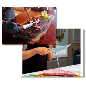 O que você receberá 1 Faca7 Polegadas - 30,5 cm 1 Garfo Trinchante 5polegadas - 26 cm 1 Chaira 7 polegadas - 30 cm