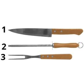 Jogo para Churrasco 3 PEÇAS com Lâminas em Aço Inox e Cabos de Madeira Natural 3 Peças você irá servir as melhores carnes de um jeito prático e saboroso. São três peças ideais para levar bom gosto e sofisticação à este momento. Com lâmina em aço inox, a faca de 7 polegadas possui maior durabilidade do fio devido ao tratamento térmico. O garfo e pegador contam com maior espessura e uma estampagem do aço que garante maior resistência, evitando deformações. São peças com cabo de madeira natural que deixam a mesa do churrasco ainda mais bonita.