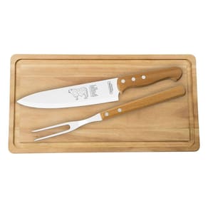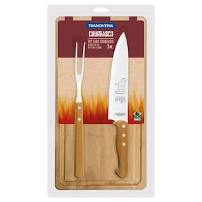 Kit para Churrasco Tramontina com Lâminas em Aço Inox e Cabos de Madeira Natural 3 Peças Com o Kit para Churrasco Tramontina com Lâminas em Aço Inox e Cabos de Madeira Natural 3 Peças o sucesso da reunião em família está garantido! Prático e sofisticado, ele oferece bom gosto na hora de servir as melhores carnes. São três peças: a faca de oito polegadas possui lâmina de aço inox e garante maior durabilidade do fio devido ao tratamento térmico, o garfo conta com maior espessura e uma estampagem do aço que garante maior resistência, evitando deformações. Muito confortáveis, possuem cabo de madeira natural. Além disso, o kit acompanha uma tábua de madeira perfeita para cortar e servir. Informações Gerais Lâminas de aço inox. As lâminas das facas têm maior durabilidade do fio devido ao tratamento térmico. As lâminas dos garfos conta com maior espessura e uma estampagem do aço que garante maior resistência, evitando deformações. Os cabos são de madeira natural. Rebites de alumínio. Tábua de madeira ideal para cortar e servir.