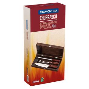Kit para Churrasco Tramontina em Aço Inox Cabo Vermelho Polywood com Estojo de Madeira 4 Peças O Kit para Churrasco Tramontina em Aço Inox Cabo Vermelho Polywood com Estojo de Madeira 4 Peças impõe respeito e admiração. Um belíssimo kit da linha Churrasco com faca para carne e garfo trinchante com lâminas em aço inox e chaira com haste de aço carbono cromado. Com cabos de madeira tratada Polywood, que deixam as peças ainda mais bonitas e resistentes à impactos e altas temperaturas. Para acompanhar e trazer esse ar rústico para qualquer ambiente, conta estojo de madeira.