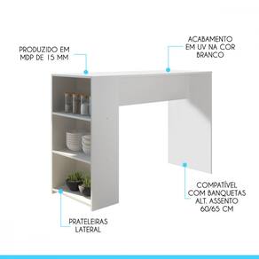 Características da Bancada: Estrutura em MDP de 15 mm com acabamento em pintura UV na cor branca. Possui prateleiras laterais que contribuem para a organização e funcionalidade do espaço, além de altura com banquetas médias. Ideal para compor ambientes compactos com sofisticação e eficiência.