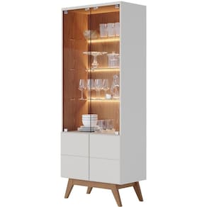 Características da Cristaleira: Estrutura em MDP 15mm e 25mm. Cristaleira na cor Off White Matte Freijó. Possui 02 portas com vidro. Possui 03 prateleiras com fitas de Led. Espaço Armazenamento inferior com, 02 portas em MDP. Pés estilo retrô em, Madeira Maciça.