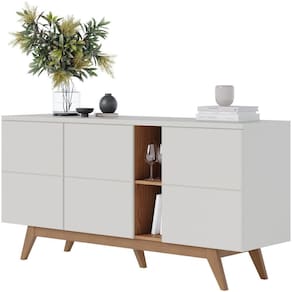 Características do Buffet: Estrutura em MDP 15mm e 25mm. Buffet na cor Off White Matte Freijó. Possui 03 portas, com divisórias internas. Possui 02 nichos decorativos em tom Amadeirado. Pés em Madeira Maciça.