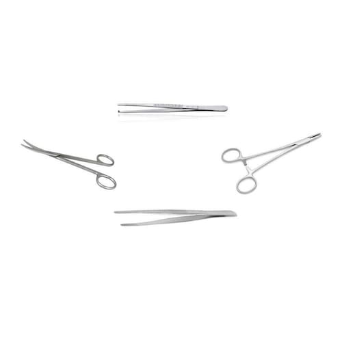 Ficha técnica - Com data de validade: Não - É estéril: Não - Cor: Cinza escuro Relação dos itens que acompanham o Kit: 1- Tesoura Metzembaum Curva - 18 Cm 1- Pinça Anatômica Dente De Rato - 16 Cm 1- Pinça Anatômica Dissecção 16 Cm 1- Porta Agulha Mayo Hegar Reta - 14 Cm