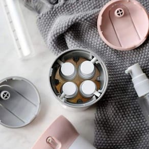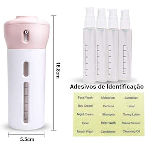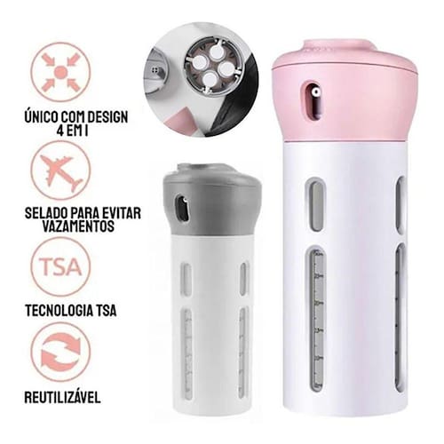 Incrível dispenser viagem 4 em 1 para guardar cosméticos, shampoo, cremes, hidratantes, óleos, entre outros. 100% recomendado para viagens curtas ou longas, para caminhoneiros, ou simplesmente usar em sua própria casa, pois a praticidade do produto é um diferencial que irá agilizar o seu dia-a-dia.Leve com você até 4 cosméticos diferentes, o corpo resistente do produto protegerá todo o conteúdo interno, evitando assim, que seus produtos sejam amassados e derramados dentro de mochilas e malas.Para despejar seus cosméticos, o porta cosméticos conta com uma válvula de pressão eficiente e macia, facilitando o uso sem causar nenhum problema.Tenha sempre à disposição seus cosméticos mais usados, evitando perdas e excesso de bagagem ao sair de casa.Especificações:Material: abs, pc.Capacidade de cada frasco: 40 ml.Medidas: 5.5 cm de diâmetro e 16.8 cm de alturaConteúdo da embalagem: 1 estojo rígido, 1 cartela de adesivos e 4 frascos de 40 ml cada.Cor: aleatório conforme estoqueDicas do produto:1- sempre que trocar de cosmético em um frasco, higienize com água corrente e sabão.2- não misture mais de um cosmético no mesmo frasco.3- não deixar no sol extremo por muito tempo.Dúvidas frequentes.Quais produtos posso colocar nos frascos R : cosméticos em geral, shampoo, condicionador, hidratante, óleos comporais, cremes, protetor solar, loções, gel, entre outros.Qual a capacidade de cada frasco R : cada frasco comporta 40 ml.O produto é resistente R : sim, o exterior é feito em plástico abs, é rigído e resistente.Excelente produto, compre agora e garanta o melhor preço.