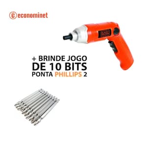 Parafusadeira bivolt 3,6V 9036 Black & Decker vem com uma bateria de 3,6V e é extremamente leve para que você possa apertar ou afrouxar parafusos com mais rapidez e praticidade. Ela vem com capacidade de uso em 2 posições distintas, sendo perfeita para alcançar locais de difícil acesso, permitindo assim que sua aplicação possa ser concluída com menor dificuldade. Inclui duas pontas: Fenda e Philips. Informações Técnicas: Marca: BLACK+DECKER Modelo: 9036-BR Cor: Laranja Voltagem: 3.6 Volts Tipo de fonte de energia: Bateria Rotações por minuto: 180 rpm *************************************************************************************************** Jogo 10 Pontas Dupla Bits Phillips 2 Para Parafusadeira em Aço Cromo Vanádio com Alta Qualidade
