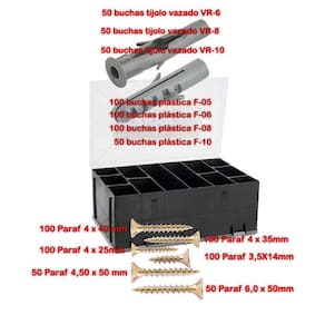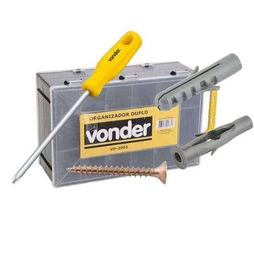 Descrição Descrição: Kit Parafuso Chipboard com maleta organizadora plástica dupla VD 2003 VONDER. Acompanha bucha plástica para tijolo vazado, bucha plástica de fixação + parafusos madeira chipboard, cabeça chata, fenda cruzada/phillips Vonder + 1 Chave Philips - Parafusos Possui acabamento bicromatizado, que aumenta a resistência contra corrosão/oxidação, além de cabeça tipo phillips, que proporciona maior força de aperto e menor possibilidade da chave ou bits escapar e riscar a peça que está sendo trabalhada.Indicado para fixações em madeiras e derivados, como: aglomerados, pínus e MDF. Pode ser utilizado também em alvenaria com o auxílio de uma bucha para tijolo vazado, que acompanha o kit. Conhecido como parafuso CHIPBOARD. devido a sua rosca com filetes espaçados e ângulo agudo, permite a aplicação sem a necessidade de pré furo - Bucha Bucha plástica de fixação - Excelente elasticidade, amortecendo vibrações. Indicada para fixações em concreto e alvenaria. Bucha plástica para tijolo vazado -Fabricadas em plástico de elevada qualidade, garantindo uma instalação segura e fixação de qualidade. Indicada para fixações em tijolo vazado/oco. - Organizador plástico duplo, VD 2003, VONDER Organizador plástico. Duplo, com duas tampas e divisórias removíveis e adaptáveis. Indicado para organizar e armazenar peças e acessórios em geral. - Conteúdo da maleta organizadora: Parafusos 100 Peças - Parafuso Para Madeira 3,5 X 14mm Cabeça Chata Bicromatizado 100 Peças - Parafuso Para Madeira 4,0 X 25mm Cabeça Chata Bicromatizado 100 Peças - Parafuso Para Madeira 4,0 X 35mm Cabeça Chata Bicromatizado 100 Peças - Parafuso Para Madeira 4,0 X 40mm Cabeça Chata Bicromatizado 050 Peças - Parafuso Para Madeira 4,0 X 45mm Cabeça Chata Bicromatizado 050 Peças - Parafuso Para Madeira 6,0 X 40mm Cabeça Chata Bicromatizado