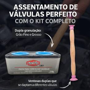 Kit para Esmerilhar Válvulas com Pasta Abrasiva e Aplicador com Ventosas Esse kit completo é ideal para o assentamento preciso de válvulas em motores automotivos, oferecendo praticidade e acabamento em serviços de manutenção. A pasta abrasiva conta com dupla granulação - grão grosso para desbaste inicial e grão fino para o acabamento final. O aplicador possui ventosas em ambas as extremidades, adaptando-se a diferentes tamanhos de válvulas e facilitando o trabalho manual. Benefícios: Assentamento de válvulas com precisão Pasta com grão grosso e fino no mesmo recipiente Aplicador com ventosas duplas para melhor aderência Ideal para motores de carros, motos, tratores e afins Fácil manuseio e aplicação, mesmo para uso doméstico Conteúdo do Kit: 1 pasta abrasiva para esmerilhamento de válvulas dupla granulação 1 aplicador manual com ventosas