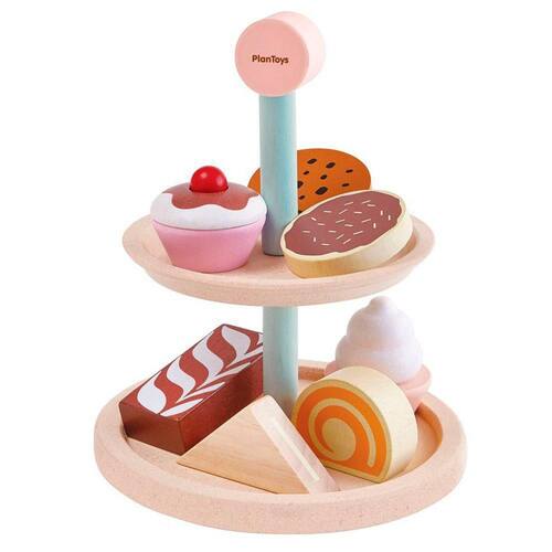 O conjunto consiste em um suporte para sobremesas de dois andares com um sanduiche, uma fatia de rocambole, um bolo de chocolate, dois biscoitos e dois cupcakes.