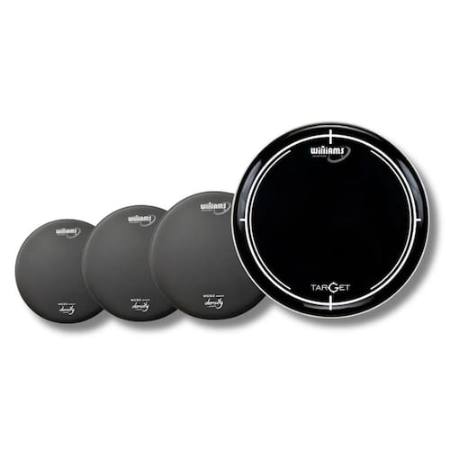 Pele dupla e porosa com filme duplo 10 mil de espessura cada filme Porosidade com acabamento preto Possui óleo entre as peles, no formato de pele hidráulica Boa durabilidade com excelente controle de harmônicos e ressonância Semelhante a Remo Pinstripe Coated e Evans Hydraulic Coated acessíveis Williams é uma marca brasileira de peles importadas Pele acessível com bom custo x benefício