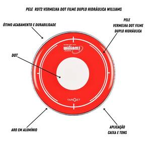 Kit de Peles RDT2 Vermelha Dot Filme Duplo Hidráulica Williams e 14 porosa para caixa Pele de filme duplo VERMELHA transparente com óleo e Dot Espessura: 7 mil milésimo de polegada ou 0.188mm cada filme Pele com bola branca central indicada Focada em um som de frequências intermediárias, com ataque definido, Controle de harmônicos e excelente durabilidade