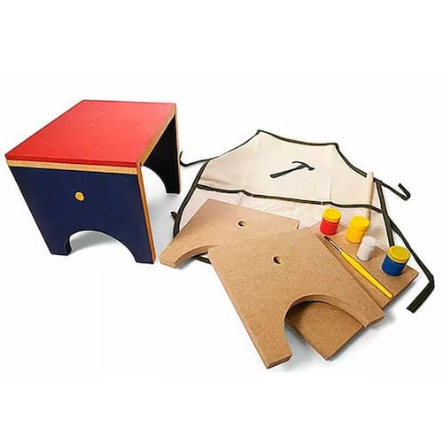 A criança monta e pinta o banquinho em MDF. A atividade dispensa o uso de pregos pois as peças são encaixadas e coladas.