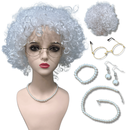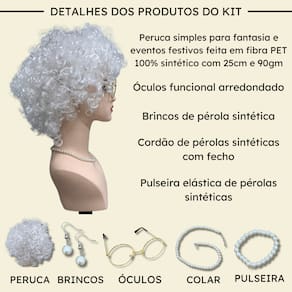 - Fibra kanekalon pet; - 25cm de comprimento; - Modelo Wig Tradicional; - Temperatura máxima aceita 130º ; - Tamanho da peruca M (Produto flexível); - 90 gramas em média;- Kit completo com peruca, brincos, óculos, colar e pulseira.