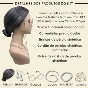 - Fibra kanekalon pet; - 35cm de comprimento; - Modelo Wig Tradicional; - Temperatura máxima aceita 130º ; - Tamanho da peruca M (Produto flexível); - 110 gramas em média;- Kit completo com peruca, brincos, óculos, cordão, colar e pulseira.