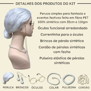 - Fibra kanekalon pet; - 35cm de comprimento; - Modelo Wig Tradicional; - Temperatura máxima aceita 130º ; - Tamanho da peruca M (Produto flexível); - 110 gramas em média;- Kit completo com peruca, brincos, óculos, cordão, colar e pulseira.