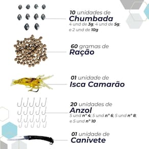 Kit pesca completo 3 varas telescópica + 3 molinetes + iscas Kit acompanha: 3 linhas já enroladas no carretel do molinete 3 varas telescópicas de 1,7 para molinete 3 molinetes ultra light 5 unidades de anzol nº 4 5 unidades de anzol nº 6 5 unidades de anzol nº 8 5 unidades de anzol nº10 4 unidades de chumbada de 5g 2 unidades de chumbada de 10g 4 unidades de chumbada de 3g 9 unidades de boias lambari 1 unidade de snap com girador 1 unidade de 1 unidade de isca lambari 1 unidade de isca camarão 1 pacote de ração com 60g 1 maleta Especificações técnicas: Vara Fabricante: cmik Modelo: telescópica Material: fibra de vidro Utilização: molinete Tamanho: 1,70m Potência: leve Três passadores + ponteira Medida da vara recolhida e com o protetor de ponta 48 cm Peso: 105 gramas Disponível nas cores: verde / azul / vermelho / amarelo Molinete: Marca: cmik ou taue Material do corpo: grafite Material do carretel: grafite Manivela: intercambiável direito ou esquerdo Knob: plástico - sistema anti - reverso Velocidade de recolhimento: 5.2:1 Capacidade de linha: 0,18mm 245m / 0,20mm 200m / 0,25mm 125m Peso: 140 gramas Rolamentos 2 Marca: Não Informado Ean: 0790001530261